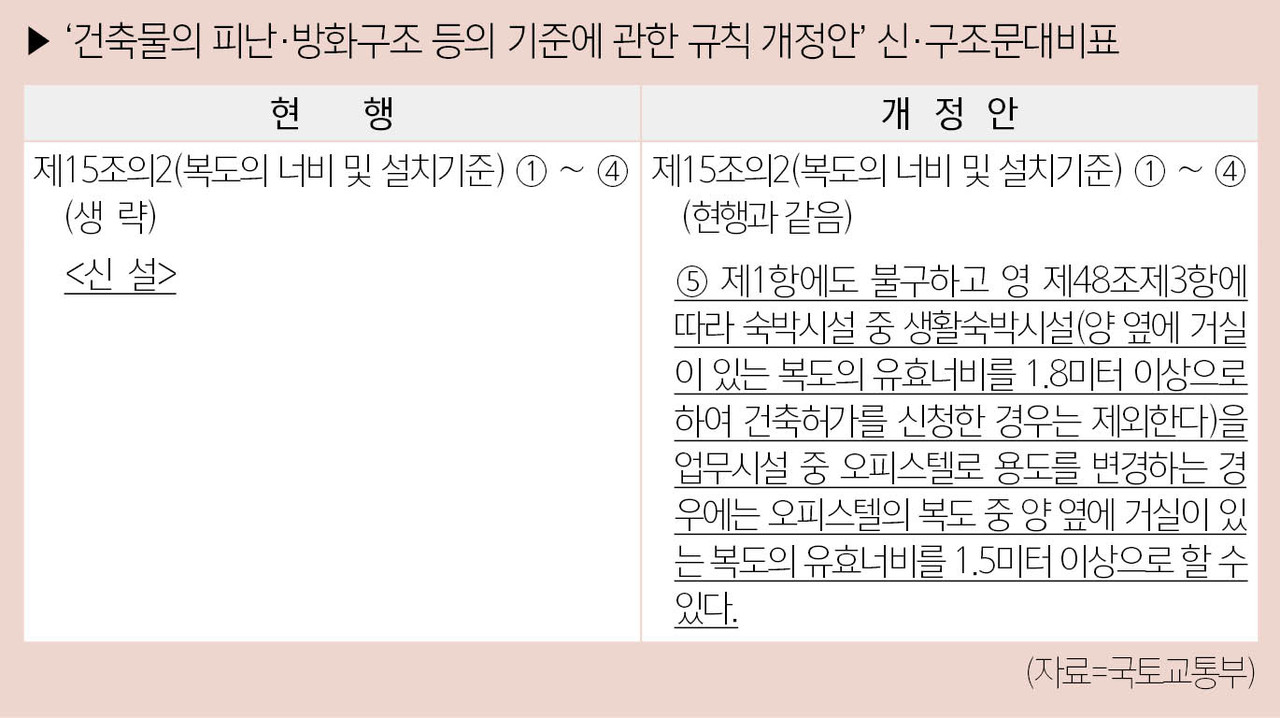 국토교통부는 생활숙박시설을 오피스텔로 용도 변경하는 경우, 일정 요건을 갖춘 경우에 한해 오피스텔의 복도 설치 기준을 완화할 수 있도록 한 ‘건축물의 피난·방화구조 등의 기준에 관한 규칙’ 개정안을 4월 24일 공포하고, 7월 16일부터 시행한다고 밝혔다.