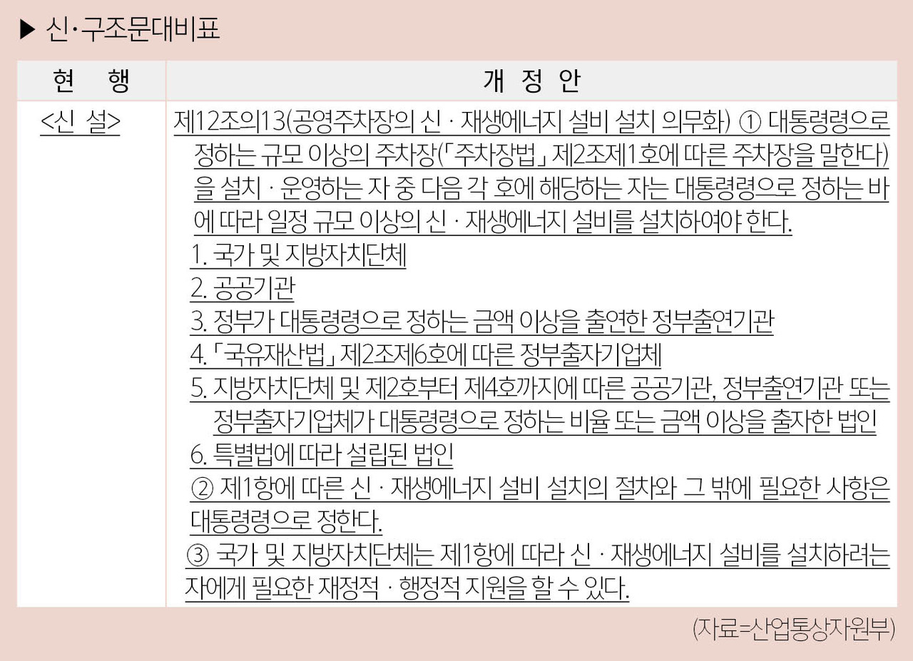 오는 11월 28일부터 일정 규모 이상의 공영주차장을 설치·운영하는 공공기관 등은 신·재생에너지 설비를 의무적으로 설치해야 한다. 국가와 지방자치단체는 이를 위한 재정적·행정적 지원을 할 수 있도록 규정했다.