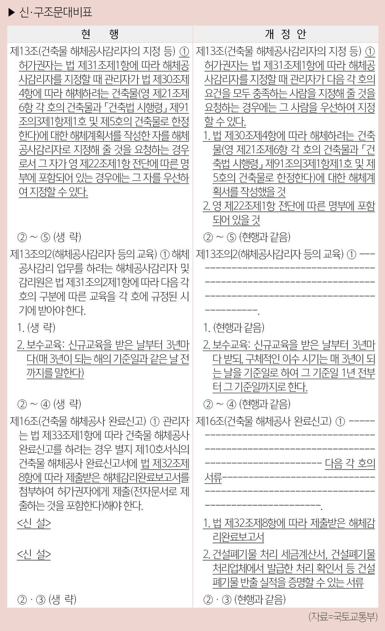 건축물 해체공사와 관련해 해체공사감리자의 보수교육 이수 시기가 명확해지고, 해체공사 완료신고 시 제출서류에 건설폐기물 반출 실적 증명자료가 추가됐다.