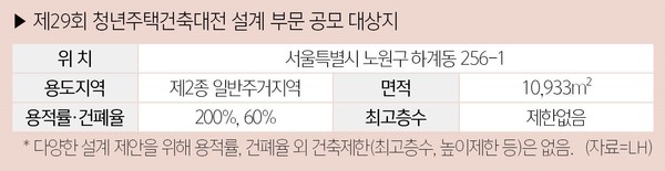 LH의 29번째 ‘청년주택건축대전’이 열린다. 설계 부문 대상지는 서울 도심 내 역세권 부지이고, 용적률 200% 이하, 건폐율 60% 이하의 조건을 충족해야 한다.