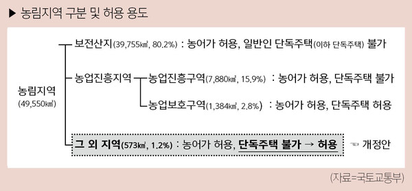 우선 농림지역에서 농어업인이 아닌 일반 국민도 단독주택을 지을 수 있도록 허용한다. 그간 농지법에 따라 농업보호구역 등 일부지역에서 일반 국민의 주택 건축이 허용되어 왔지만, 이번 국토계획법 시행령 개정으로 농림지역에서도 국민 누구나 부지 1천 제곱미터 미만의 단독주택 건축이 가능해진다.