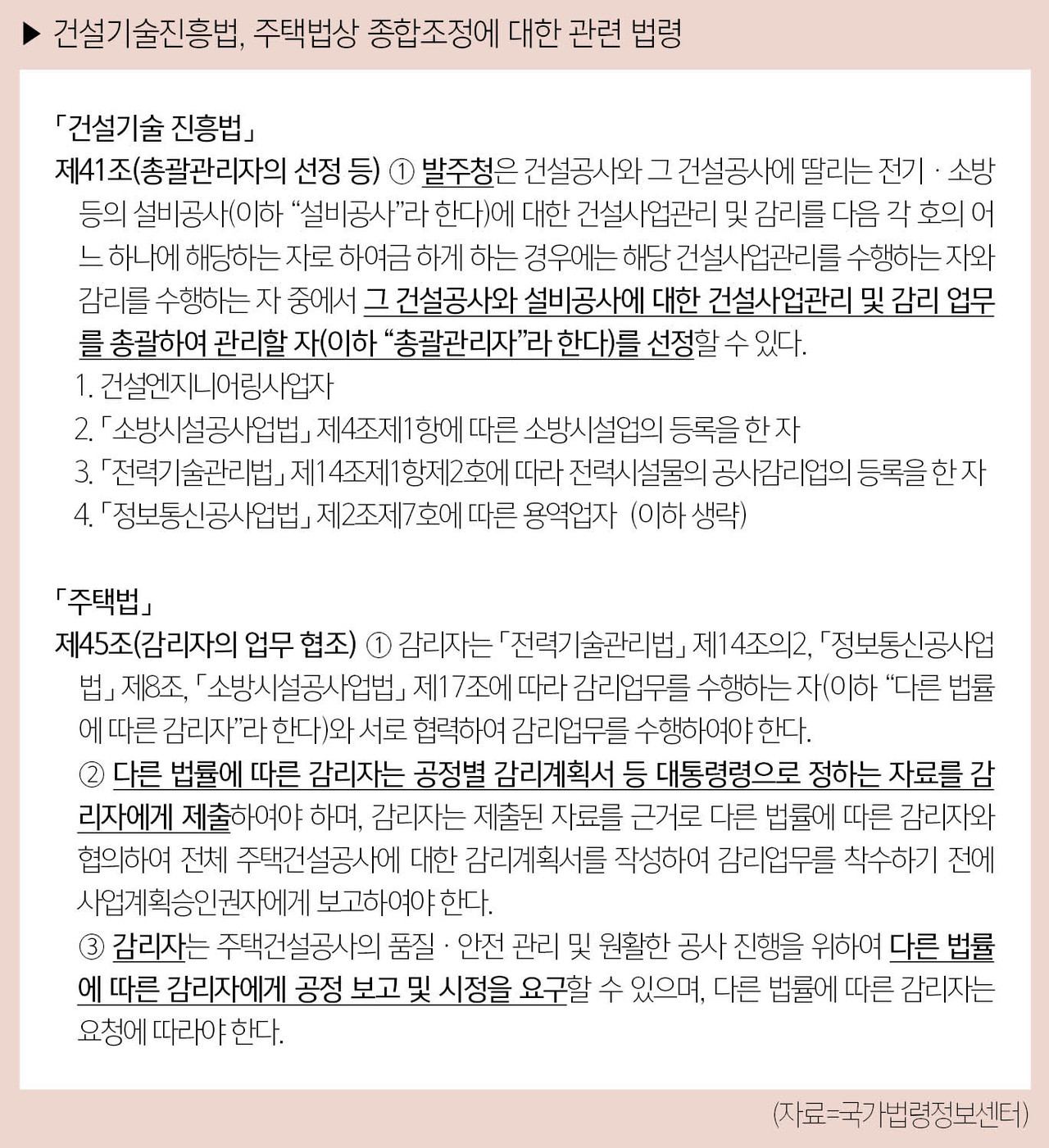 특히 보고서는 “이미 국가·지방자치단체 등이 발주하는 건설공사와 주택공사 감리의 경우, 종합조정에 대한 관련 법령〔건설기술진흥법 제41조(총괄관리자의 선정 등), 주택법 제45조(감리자의 업무 협조)〕이 마련돼 있는바, 민간분야 건축의 경우 설계자·공사감리자가 건축주의 필요에 따라 종합조정 업무를 수행하도록 규정하는 것이 바람직할 것으로 보인다”라고 강조했다.