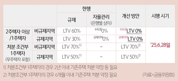 우선, ▲수도권 및 규제지역 내에서 2주택 이상 보유자가 추가 주택을 구입하거나 ▲1주택자가 기존 주택을 처분하지 않고 추가 주택을 구입하는 경우, 추가 주택구입 목적 주담대를 금지(LTV=0%), 실거주 목적 등이 아닌 추가 주택구입 수요를 차단한다. 반면, 1주택자가 기존 주택을 6개월 이내에 처분할 경우(처분 조건부 1주택자), 무주택자와 동일하게 비규제 지역 LTV 70%, 규제지역 LTV 50%를 적용한다.