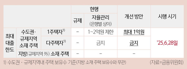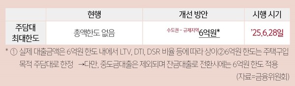 금융회사가 수도권·규제지역 내에서 취급하는 주택구입목적 주담대(정책대출 : 자체한도 적용, 중도금 대출 : 적용 제외)의 최대한도를 6억 원으로 제한해, 고가주택 구입에 과도한 대출을 활용하는 것도 제한된다.