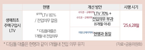 수도권·규제지역내 생애 최초 주택구입 목적 주담대(이하 ‘생초 주담대’)의 LTV를 강화(80% → 70%)하고, 전입의무(6개월 이내)를 부과한다. 특히, 동 방안은 정책대출(디딤돌, 보금자리론)에도 동일하게 적용된다.