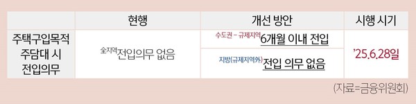 뿐만 아니라, 수도권·규제지역 내 주택구입시 주담대를 받은 경우 6개월 이내 전입 의무를 부과해 금융권 대출은 실거주 목적에 한해 활용할 수 있도록 한다. 이는 정책대출(보금자리론)에도 동일하게 적용할 예정이다.