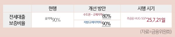 끝으로, 수도권·규제지역내 전세대출 보증비율을 현행 보다 강화(90% → 80%)해 전세대출에 대한 금융회사들의 여신심사 강화를 유도한다.
