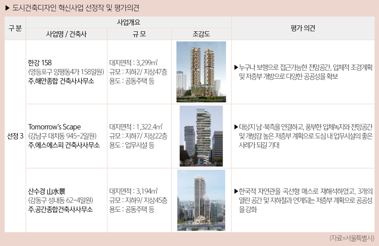 서울시는 지난해 2월부터 진행된 ‘제3차 도시건축디자인 혁신’ 공모 결과, 영등포구 양평동 ‘한강 158’, 강남구 대치동 ‘Tomorrow’s Scape’, 강동구 성내동 ‘산수경’ 등 3개 사업지를 최종 선정했다고 14일 밝혔다.