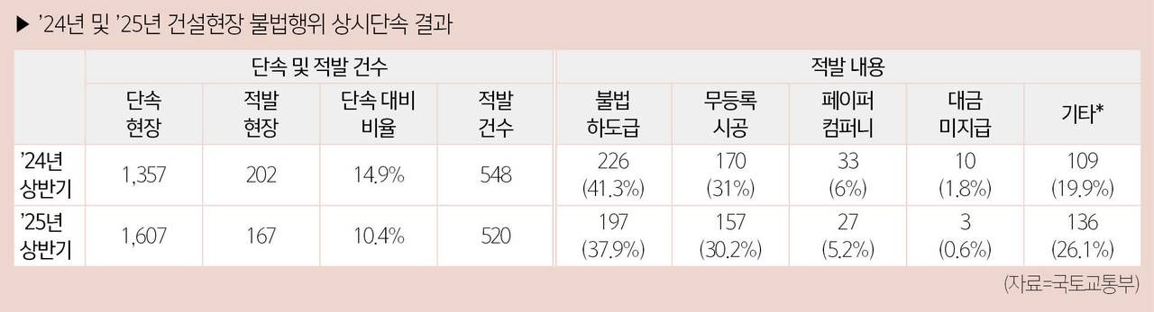 국토교통부는 올해 상반기 전국 1,607개 건설현장을 대상으로 불법하도급, 페이퍼컴퍼니 등 건설업체 불법행위에 대한 상시 단속을 실시해 520건을 적발했다고 17일 밝혔다.