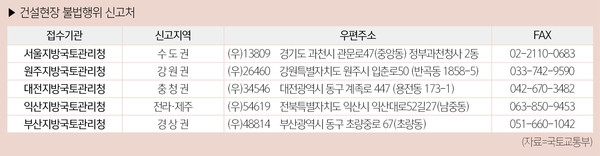 국토부는 각 지방국토관리청(서울, 원주, 대전, 익산, 부산)에 설치된 ‘공정건설지원센터’를 통해 불법행위 신고를 접수하고 있다. 센터 방문 외에도 국토부 누리집(www.molit.go.kr), 우편, 팩스, 전화(1577-8221)를 통해 신고할 수 있으며, 최초 신고자에게는 심의를 거쳐 최대 200만 원의 포상금이 지급된다.