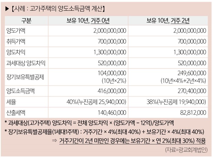 위 사례와 같이 고가주택을 보유한 1세대 1주택자가 해당 주택을 양도하는 경우, 최대 80%까지 장기보유특별공제를 적용받을 수 있으므로 해당 주택에 장기간(최소 2년, 최대 10년) 거주하는 것이 절세에 도움이 됩니다. 또한 1세대 1주택 비과세는 사례별 상황에 따라 요건이 달라질 수 있으므로, 필요시 전문가의 도움을 받는 것이 바람직합니다.