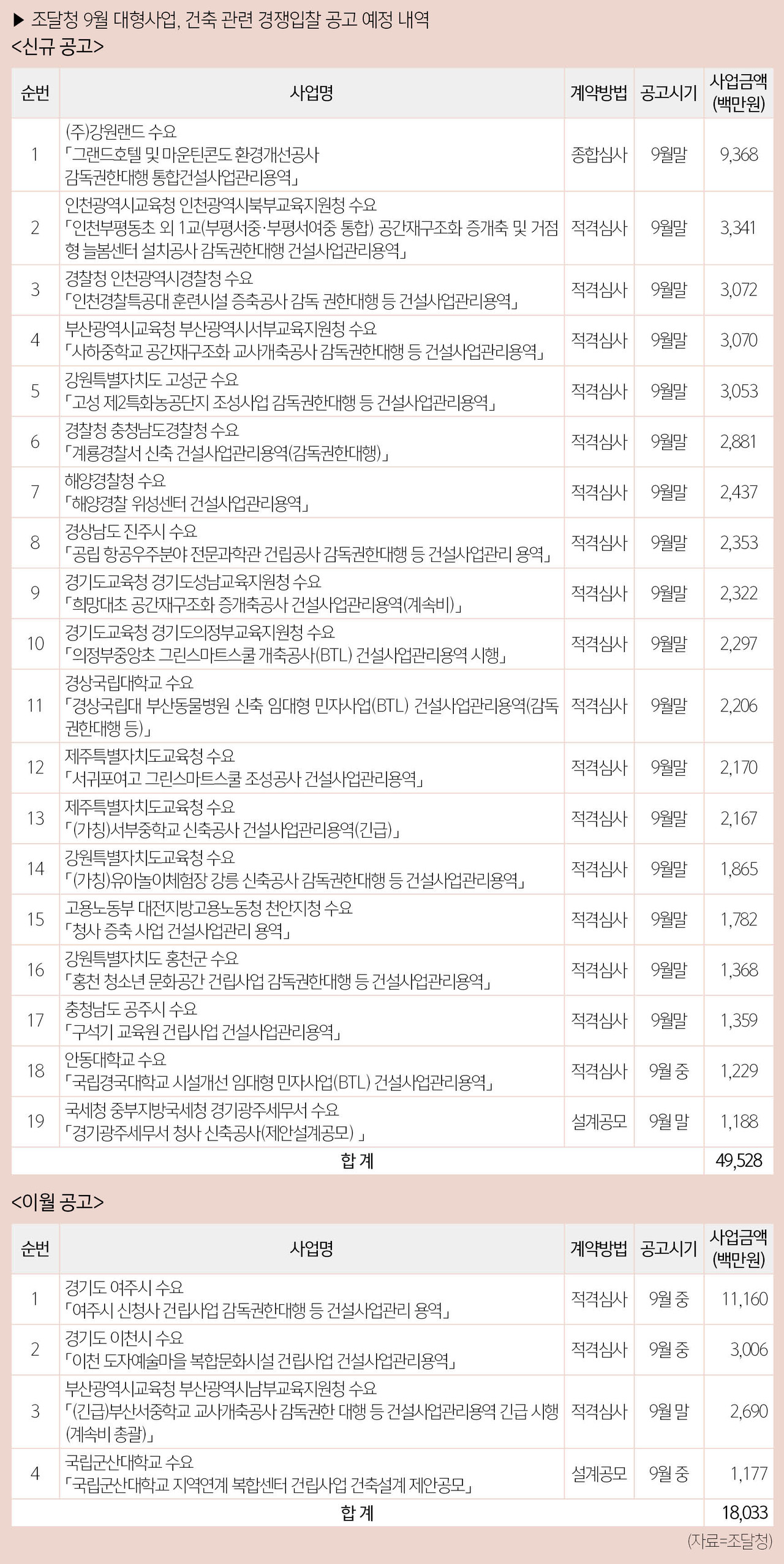 조달청은 9월 한 달 동안 총 164건, 2조 9,856억 원 규모의 대형사업 경쟁입찰을 추진한다고 8월 29일 밝혔다. 대형사업은 물품·용역 10억 원, 공사 100억 원 이상을 기준으로, 신규 공고는 115건 1조 2,217억 원, 이월 공고는 49건 1조 7,639억 원 규모다.