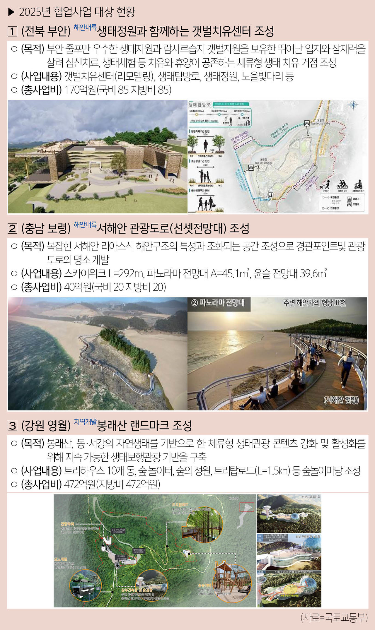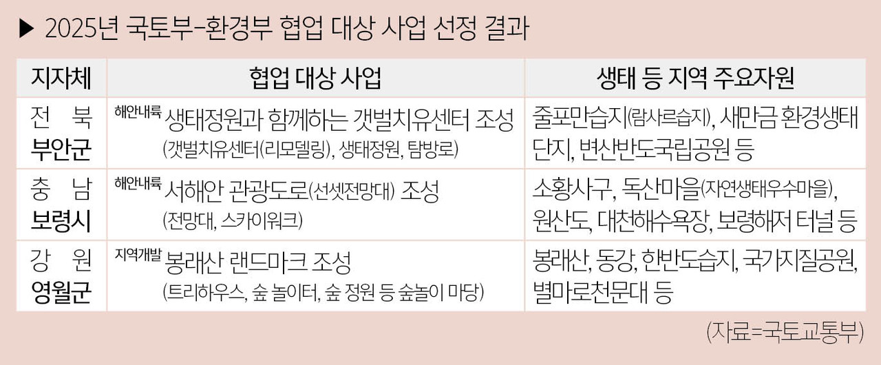 국토교통부와 환경부가 지역균형개발과 생태관광 활성화를 위한 협업 사업 대상지 3곳을 9월 1일 최종 확정했다. 대상지는 전북 부안군 생태정원 및 갯벌치유센터, 충남 보령시 선셋전망대, 강원 영월군 봉래산 랜드마크다.