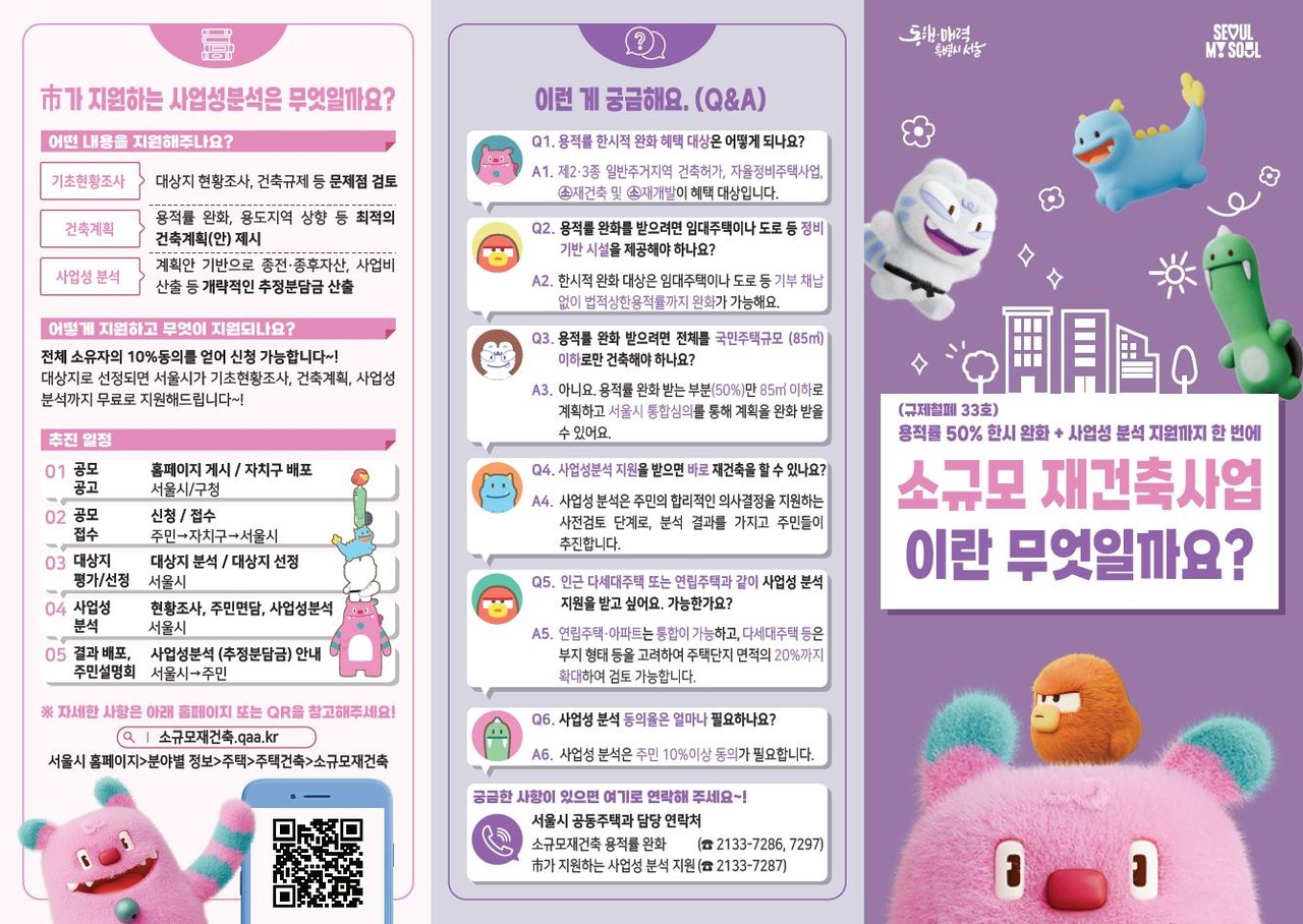 시는 매년 소규모재건축 대상지를 선정해 사업성 분석을 지원한다. 올해는 16개소를 대상으로 분석을 진행 중이며, 결과에는 분담금 추정, 자산 분석, 규제 대안 등을 들어간다. 또 국토교통부에 소규모 재건축도 주택도시보증공사의 저금리 융자상품 대상에 적용해 달라고 건의했으며, 재건축이익환수법 적용 재검토도 요청하고 있다.