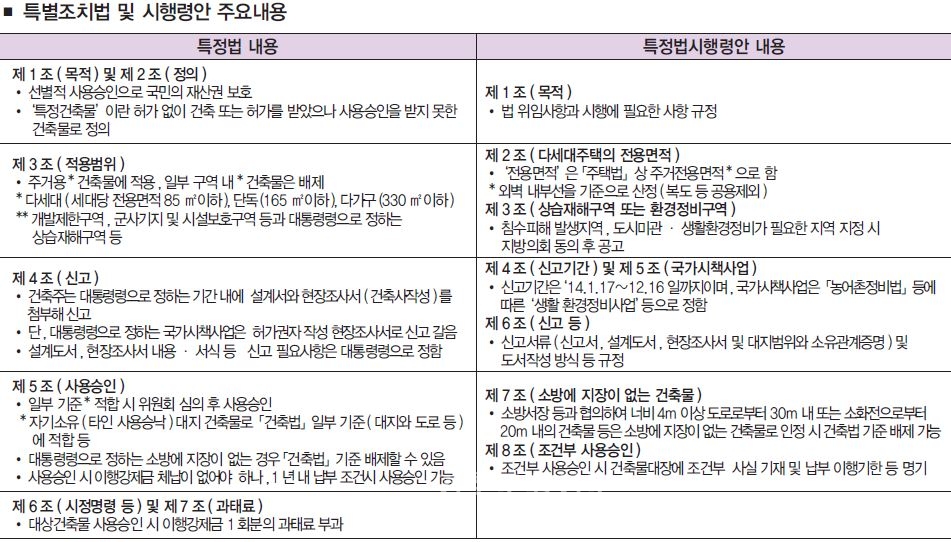 국토교통부는 그동안 건축법령에 적합하지 않게 건축되거나 대수선된 주거용 건축물을 양성화하는「특정건축물 정리에 관한 특별조치법」이 1월 17일부터 2015년 1월 16일까지 1년간 한시적으로 시행된다고 밝혔다. 이번 특별조치법의 대상은 2012년 12월 31일 이전에 사실상 준공된 건축물 중 연면적의 100분의 50% 이상이 주거용으로 사용되는 건축물로 건축허가(신고)를 받지 않았거나, 허가(신고) 이후 위법 시공 등으로 사용승인을 받지 못한 건축물이다.