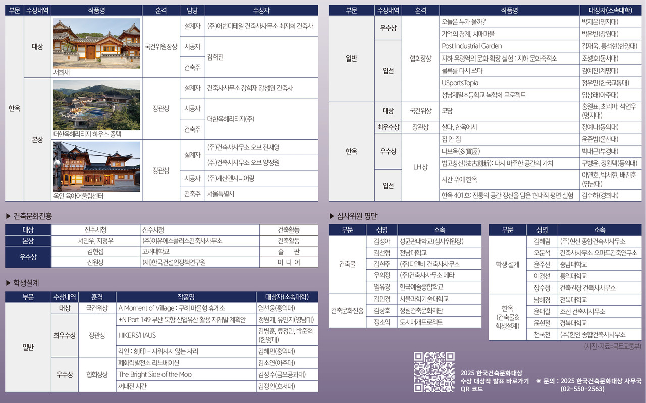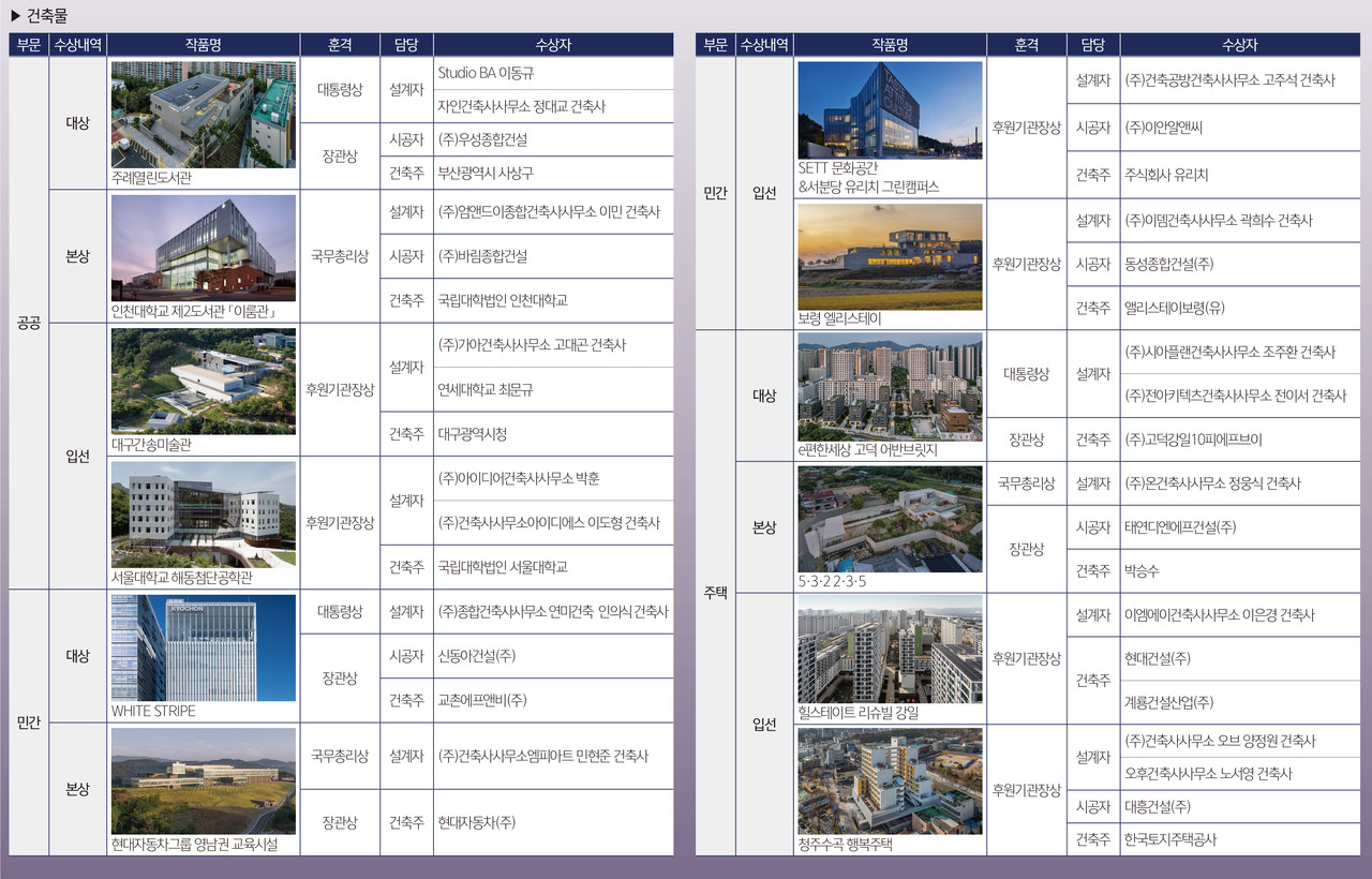 공공·민간·주택 부문과 건축문화진흥 부문 대상에는 대통령상이, 한옥 부문과 학생설계공모전 대상에는 국가건축정책위원장상이 수여된다.