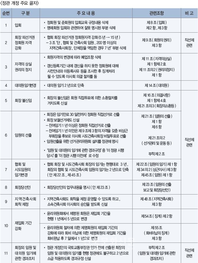 특히 회장 선거가 직선제로 치러짐에 따라 관련 정관개정과 ‘입회, 자격, 대의원’ 등이 개정될 예정이다. 직선제로 개정이 필요한 정관내용은 회장 피선거권 정회원 자격 강화, 회장 불신임, 임원의 선출, 협회 및 시도임원의 임기변경, 회장 당선인, 회장외 임원 및 대의원 임기에 관한 경과조치이다.