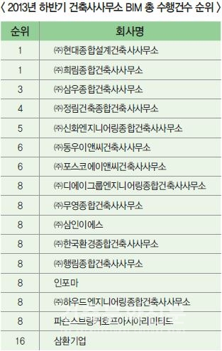 2013년 하반기 BIM적용실적 등록순위는 건축사사무소 분야에서 ㈜현대종합설계건축사사무소, 엔지니어링/CM 분야에서 ㈜예다종합설계감리사무소, BIM전문업체 분야에서는 한국씨.아이.엠㈜이 각각1위를 차지했다.