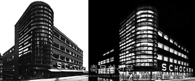 그는 1925년부터 1932년까지 유럽 각지에 6개의 크고 작은 상업적 건물을 설계했다. 그 중 두 개는 작은 상점(Rudolf Petersdorff store in Breslau, 1927 / Doblouggarden store in Oslo, 1932)이고, 두 개는 백화점 리모델링 프로젝트(Schocken department store in Nuremberg, 1925 / Cohen & Epstein department in Duisburg, 1925) 그리고 두 개는 신축 백화점 프로젝트(Schocken department store in Stuttgart, 1926 / Schocken department store in Chemnitz, 1927)다. 이 중에서 우리는 그의 첫 신축 백화점 건물인 스투트가르트 쇼큰백화점을 살펴보자.