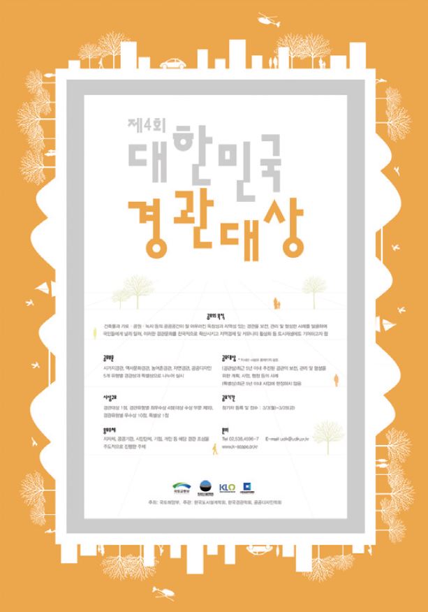 참가신청은 대한민국 경관대상 홈페이지(www.k-scape.or.kr)를 통해 이루어지며, 기타 자세한 사항은 홈페이지에서 확인할 수 있다. 제출된 작품은 전문가로 구성된 심사위원회의 심사를 거쳐 오는 5월 16일 제2회 국토경관의 날에 발표 및 시상할 예정이다.