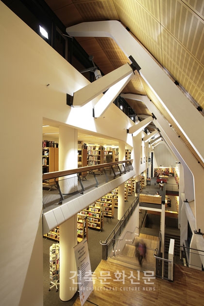 볼레스와 윌슨은 람버티 교회의 앱스(Apse)를 바라보는 쪽에 시립도서관의 계획안을 제시하면서 가장 중요한 설계개념으로 두 매스를 분리해 가운데에 길과 같은 빈 공간을 만들었다. 이 빈 공간은 ‘책의 길’이라 불리며, 교회를 향하여 있다. 책의 길은 건물의 양 끝에 테라스 공공장소를 만들었다. 길에 면한 ‘책의 빌딩’은 전통적인 도서관 프로그램을 지니고, ‘정보 빌딩’은 도서관의 주출입구와 주요 기능을 가지고 있다. ‘책의 길’은 양쪽에 두 매스를 끼고 람버티 교회를 향하고 있는 형국이 압권이다. 또 두 건물의 볼륨 차이와 높이차에 의하여 형성된, ‘책의 길’에서 교회를 향해 적절히 풍화된 구리로 된 지붕벽은 비대칭적인 모양을 가지고 긴장감을 유지하고 있다. ‘책의 길’ 동쪽 입구에 있는 조각 Die überfrau는 ‘톰 오터니스(Tom Otterness)’라는 조각가가 만들었으며, 그 의미는 작은 사람들에 의해 계속해서 재정의 되는 ‘사회의 변화를 은유한 것’이라 했다. 또한 작가의 여러 은유도 특이하다. 미국작가인 그는 왼손을 든 부처의 이미지, 역시 왼손을 든 자유의 여신상의 골조 이미지 등을 참조하며 평소에 그가 만든 작은 인물 조각상들과 더불어 8m 높이의 속이 빈 사람형상의 조각을 설치했다. 이는 도서관 사이의 거리에서 걷게 되는 우리자신의 모습이며, 작은 조각과 더불어 사회를 만들어가는 작은 상들의 해학적인 모습 또한 역사적인 조각상에 대한 오마주 등을 표현하고 있다.