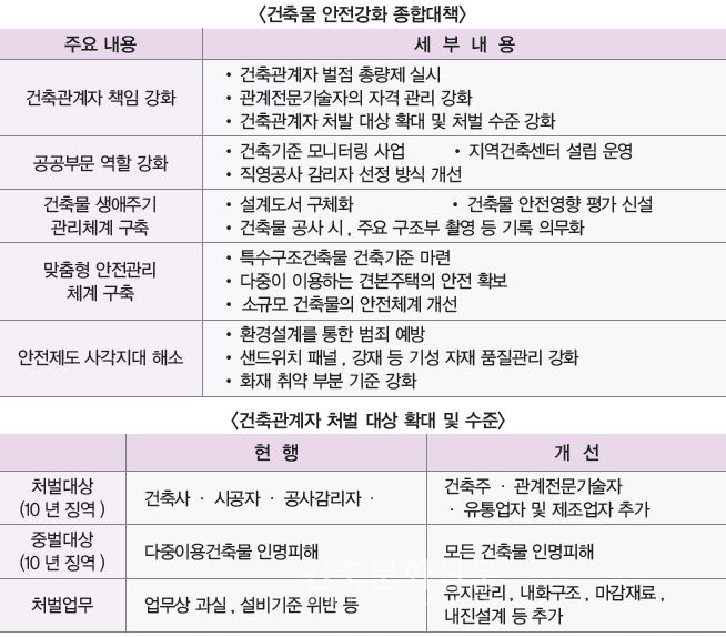 또한 건축 관계자 처벌 대상의 확대 및 처벌 수준이 강화된다. 현재는 부실 건축 발생 시 설계자·시공자·감리자만 처벌을 받았으나 앞으로는 건축주·관계전문기술자까지 확대 적용된다. 아울러 위법으로 처벌 받는 건축물이 다중이용건축물에서 모든 건축물로 확대된다.