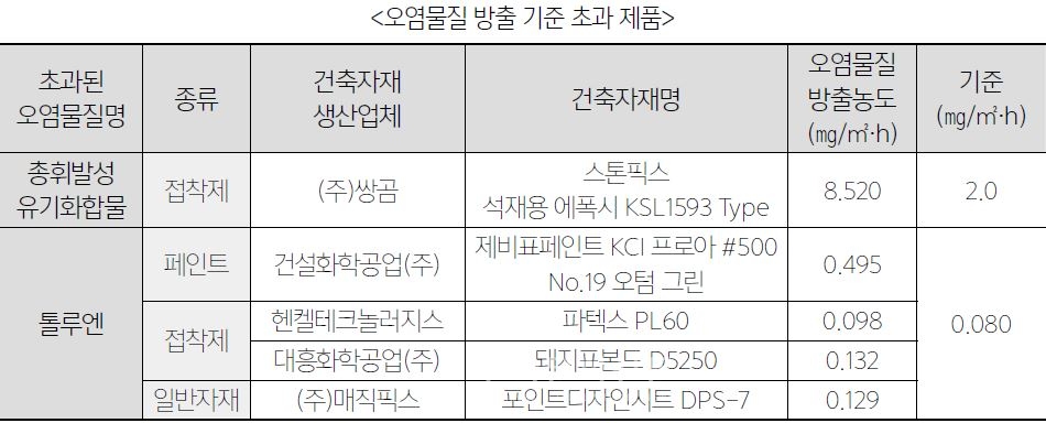 방출기준을 초과한 오염물질 중 총휘발성유기화합물은 접착제에서 기준치 대비 최대 4배 이상, 톨루엔은 페인트에서 기준치 대비 최대 6배 이상 초과한 것으로 나타났다.