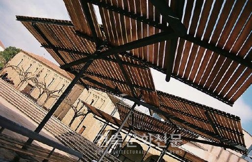 이런 분위기의 도시에서 자라고 배운 엔릭 미라예스는 스페인의 체념인 “Sol y Sombra” 즉, 빛과 그림자를 그의 건축적 어휘를 통해 젊은 시절부터 구현하여 왔다. 그는 대학에서 스승이었던 라파엘 모네오(Rafael Moneo)로부터 건축과 도시를 같이 고려하는 디자인 방법론에 대하여 배우며, 모네오가 하버드 디자인대학원의 학장 재임 시 하버드에 미라예스를 초청하여 스튜디오 교수로도 활동하게 된다. 그와 그의 처였던 카르메 피뇨스(Carme Pinos)의 협업에서 그들의 창조는 여느 건축사와 같이 작은 디테일에서부터 시작한다. 평범한 건축의 요소들인 지붕, 보, 기둥은 그들의 디테일로 색다르게 변형되었다. 물론 그의 디자인은 예술품과 같이 말로 설명되는 곳과 설명되지 않는 곳이 있지만, 그들이 잘 배우고 구사해왔던 구법과 디테일에서 의도적인 변형을 유도하며 건물과 주변 도시에 색다른 풍경을 자아낸다. 알레잔드로 데 라소타(Alejandro De la Sota)의 타라고나 시청사의 비대칭적인 정면처럼, 스페인에서는 프랑코 독재에 대한 정신적인 반발감으로 삐딱하고 비대칭적인 건축어휘가 자연스러워졌다. 미라예스의 캐노피도 기둥과 보의 비대칭적인 배열로 보는 이로 하여금 다시 한 번 구조에 대해 생각하게 한다.