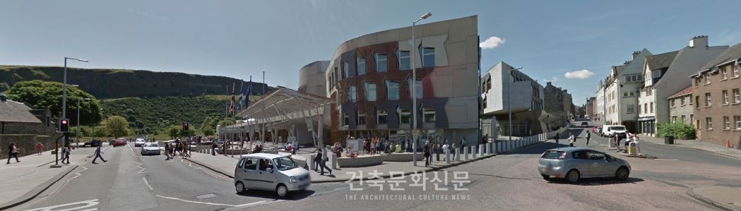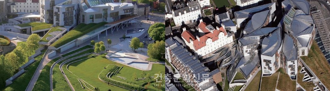 의회당은 아더왕의 의자(Arthur’s Seat)라는, 화산암이 융기한 산꼭대기를 바라보고 있다. 실제로 아더왕이 앉았을지는 모르지만 아더왕의 전설 중 갑은 역시 원탁의 기사다. 원탁은 12명의 기사가 서열에 따라 앉을지라도 같은 높이 같은 거리에 있어서 동등한 발언권을 부여한다는 민주적 개념이 있다. 건축적 뉘앙스 역시 같은 지평을 맞잡고 있다는 뜻이다. 고등학교 교실과 회사 회의실의 원탁도 같은 의미일 것이다. 누구든지 자기 의견을 동등한 입장에서 발언한다는 것이다. 같은 지평은 건물의 기단부에도 적용된다. 옛 양반집처럼 높이 오르기보다 물과 눈이 차지 않는 적절한 높이에 만들어진 기단부는 서로 평등하기 위한 전제조건이다. 미라예스는 맞은편에 있는 전통적 정원 위에 높게 위치한 호리루드 궁전과는 정반대의 야생의 흙, 즉 근처의 솔즈베리 크랙에서 뻗어 나온 것 같은 모양의 의회당을 만들고자 했다.