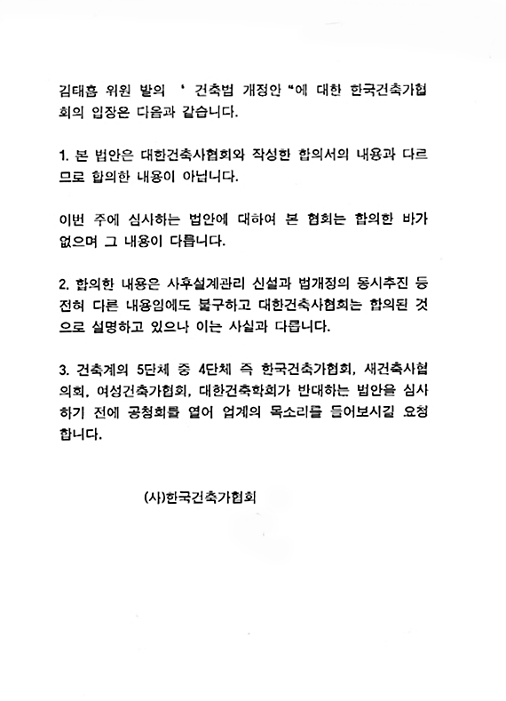 가협회는 법안심사소위에서 ‘사후설계관리 신설’과 ‘감리자 지정방법 변경’ 두 개가 함께 통과되지 못할 수 있다고 판단, 국토교통위 위원들에게 공문을 보내 반대 입장을 표명한 것으로 보인다. 이는 국토부가 사후설계관리에 대해 부정적인 입장을 보이고 있던 점을 가협회가 우려했던 것으로 보여진다.