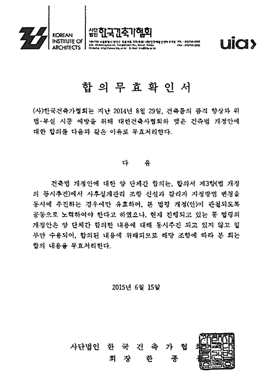 사협회는 지난 해 8월 가협회와의 합의서 작성 후 국회사무처 등을 찾아 합의안의 입법취지에 대해 설명하고, 국토부 관계자들을 만나 지속적으로 논의를 추진했다. 그러나 가협회는 합의서 이후 공동으로 노력해야 함에도 불구하고, 아무런 노력없이 방관만 하고 있었다는 것이 건축관계자의 지적이다. 한 건축계 관계자는 “지난 해 8월 두 단체 간의 합의 후 사협회만 합의안의 국회통과를 위해 노력한 듯하다”며, “가협회는 합의를 해놓고도 이런 식의 공문을 통한 반대로 일관하고 있다. 당초부터 소규모건축물 설계‧감리 개선에 대해 부정적 이었던 것으로 보인다”고 전했다.