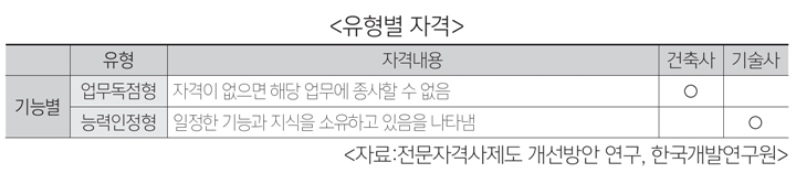 건축사․변리사․공인회계사 등의 자격은 세가지 유형별로 볼 때 기능별로는 면허를 가지는 업무독점형, 내용별로는 전문자격, 시행주체별로는 국가자격에 해당된다. 이들은 전문가 가운데 정부 등 특정 기관이 부여한 자격을 갖춘 사람으로 ‘전문자격사’라 불린다.
