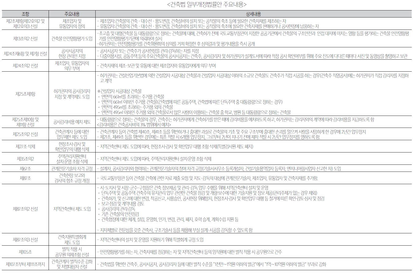 이밖에 이번 개정안은 불법행위에 대한 책임 강화내용도 담고 있다. 건축관계자 등이 중대한 과실로 건축물의 기초 및 주요 구조부에 중대한 손괴를 일으켜 사람을 사망하게 한 경우에 2년간 업무정지를, 착공신고와 피난시설 설치 등을 위반한 경우에는 최초 적발 시 6개월 업무정지, 그로부터 2년이 지나기 전에 재차 적발 시 2년간 업무정지하도록 했다.