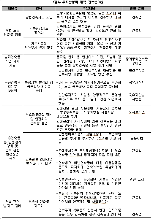 이번 대책은 관광․벤처․건축 등 성과의 조기 확산이 가능한 분야를 통해 투자회복을 선도할 수 있도록 마련됐는데, 건축분야는 투자 활성화를 위해 규제완화․인센티브 제공 등을 통한 노후 건축물 재건축과 리모델링을 촉진하도록 했다.