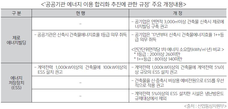 산자부는 ‘제로에너지빌딩’과 관련해 현재 구체적 기준설정이 어려운 점을 감안해 우선 시장형과 준시장형 공기업(30개)에 대해 권장 수준으로 추진하고, 국토부의 관련 제도 정비, 시범사업 등이 완료되는 2017년부터 의무화로 전환한 후, ’20년에는 모든 공공기관으로 확대하기로 했다. 이에 따라 시장형․준시장형 공기업은 연면적 3,000㎡ 이상 건축물 신축시 제로에너지 빌딩을 구축하도록 권고했다. 또한, 건축물 에너지효율 성능을 강화하기 위해 2017년부터 건축물 에너지효율등급 의무 취득기준을 현재 ‘1등급’에서 ‘1++등급’으로 상향 조정해 평균 50%정도의 에너지 효율향상이 기대된다고 밝혔다. 현재 건축물 에너지효율등급은 1차 에너지소요량에 따라 10단계(1+++등급~7등급)로 구분돼 있으며, 공공기관은 현재 1등급 이상 받아야 한다.