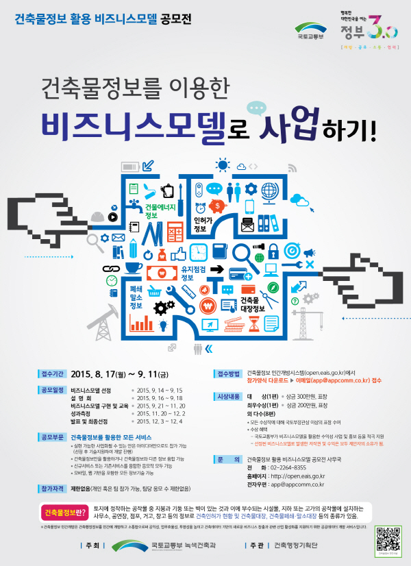 공모전은 국토교통부가 개방한 건축물정보와 건축물 외 가능한 다른 정보와의 융합 등을 활용해 새로운 서비스 확대 및 관련 산업 활성화를 위한 비즈니스모델 발굴을 목적으로 하며, 이번 공모를 통해 발생한 수익 및 지적재산권은 모두 제안자에게 귀속된다. 특히, 실현 가능성이 높은 제안은 국토교통부가 교육과 기술지원을 통해 비즈니스모델로 발전시킬 계획이며, 최종 선정된 당선작에 대해서는 건축물정보를 활용한 수익사업화모델로 발전하도록 지원한다는 방침이다.