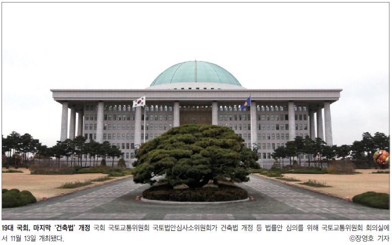 이번 개정안이 11월 12일 전체회의 법률안 의결을 거쳐 국회 본회의를 통과하면 ‘건축물의 안전성과 품질 확보’를 위한 19대 국회의 마지막 건축법 개정이 된다.