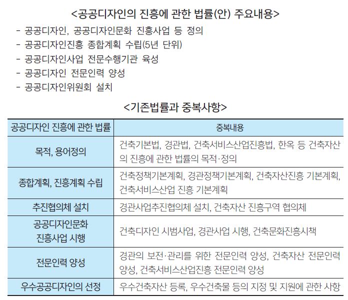건축은 건축물에 한정된 것이 아니라 도시계획, 공간환경 그리고 이에 부속되는 모든 시설 및 시설물과 연관된다는 설명이다. 이밖에 중복된 내용을 자세히 살펴보면, 공공디자인문화 진흥 종합계획과 지역공공디자인진흥계획수립 규정은 기존 법률의 건축정책기본계획 수립·경관정책