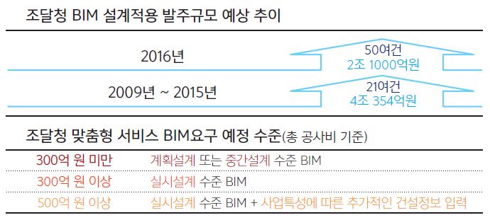 조달청은 11월 19일 공공기관 및 민간의 BIM 설계 적용을 촉진하고자 내년부터 맞춤형서비스에 ‘BIM’을 의무화한다고 밝혔다. 이미 조달청은 2010년 ‘맞춤형서비스 BIM 적용계획’을 발표하면서 맞춤형서비스 사업 BIM적용대상을 2011년에는 500억 원 이상 설계공모 및 턴키공사, 2013년에는 500억 원 이상 모든 공사, 이번 2016년 맞춤형서비스 모든 공사로 점진적으로 확대 시행해왔다.