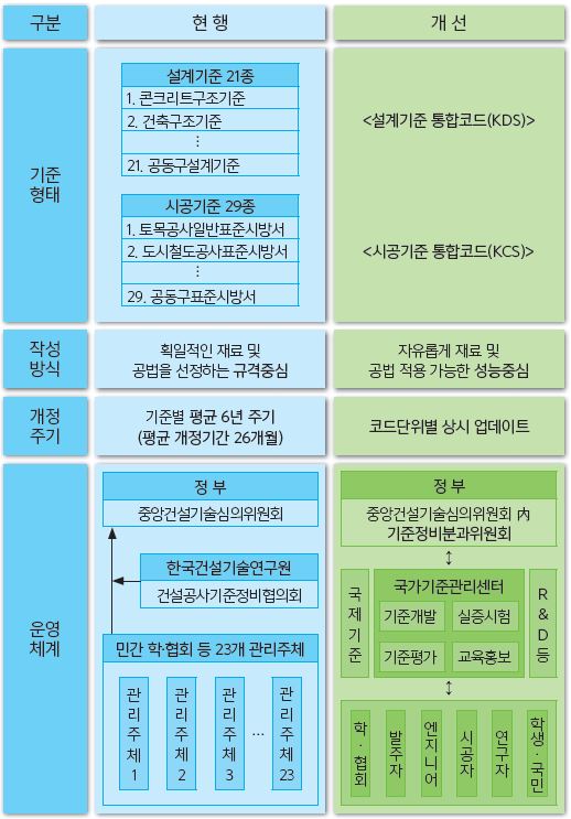 현재 국내에 사용중인 건설공사기준은 설계기준 21종, 표준시방서 21종으로 총 42종에 달한다. 기준 간 내용이 중복되고 동일한 사항에 대해 서로 내용이 상이하다. 때문에 사용상의 불편, 건설공사기준 운영의 비효율성, 분쟁 가능성 등이 상존한다는 지적을 받아왔다.