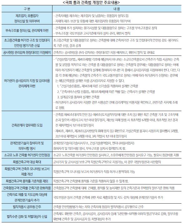 건축법에서 규정하고 있는 건축제도를 위반한 건축주, 공사시공자, 공사감리자 등에 대한 벌칙 수준을 현행 ‘500만원~1억원 이하의 벌금’에서 ‘5천만원~10억원 이하의 벌금’부과로 높여 건축관계자 벌칙수준을 강화한다는 규정도 포함됐다.
