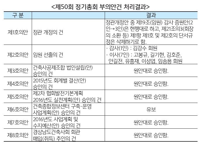 제1호의안으로 상정된 제19조(임원)·제21조의3(회장의 소환 등)을 내용으로 하는 정관 개정의 건은 제19조(임원) 감사증원안(2인→3인)은 현행대로 하고, 제21조3(회장의 소환 등) 제1항제1호 및 제2호의 단서규정은 삭제키로 했다. 건축사법 제31조의2 및 정관 제5조에 따라 건축사협회가 수행하던 건축사공제조합을 개정 건축사법에 따라 법인으로 설립하는 제3호의안 건축사공제조합 법인설립(안) 승인의 건도 원안대로 승인됐다.