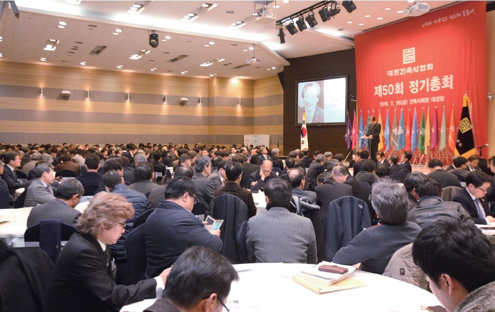 건축사협회는 2월 26일 서울 서초구 건축사회관에서 제50회 정기총회를 열고 ▶법제도개선 ▶연구개발(R&D) ▶미래인재육성 ▶사회공헌 ▶대국민홍보 등을 핵심으로 하는 2016년도 사업계획과 예산안을 의결했다. 이날 총회에는 사전에 고지된 7개 안건 이외에 현장에서 정관개정의 건이 추가 채택돼 총 8개 안건이 상정됐다.