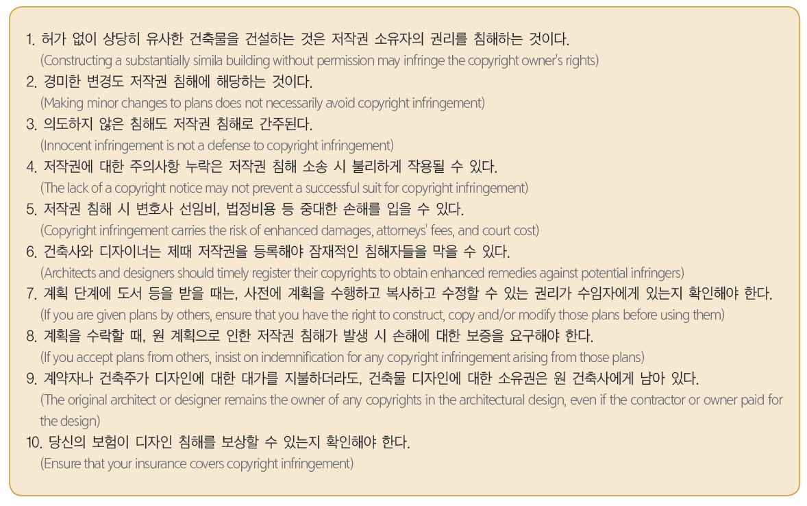 국제 건축전문지인 아키데일리에서 게재된 ‘당신이 건축 저작권에 대해서 반드시 알아야 할 10가지(The 10 things You must know about architectural copyrights)’에 대한 기사가 조명 받고 있다. 2020년 도쿄올림픽을 겨냥해 추진 중인 도쿄올림픽경기장이 자하 하디드의 디자인 표절시비에 휘말리는 등 국제적으로 건축저작권에 대한 논란이 일고 있기 때문이다. 아키데일리는 지적재산권법의 전문가인 제프리 리차즈(Jeffrey M. Reichard) 변호사가 그의 고객을 위해 쉽게 10가지로 풀어쓴 건축저작권 분쟁으로부터 도움이 되는 팁을 소개하며, “건축 저작권법 아래, 모방은 아주 비싼 시도가 될 수 있다”고 강조했다. 기사의 원문은 아키데일리 홈페이지(www.archidaily.com)를 통해 확인할 수 있다.