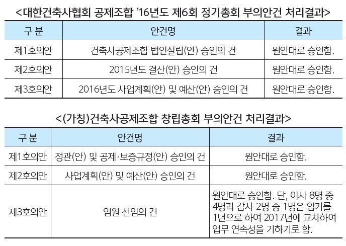 정기총회에는 3건의 안건이 상정됐다. 제1호 의안 건축사공제조합 법인설립(안) 승인의 건, 제2호 의안 2015년도 결산(안) 승인의 건, 제3호 의안 2016년도 사업계획(안) 및 예산(안) 승인의 건이다.