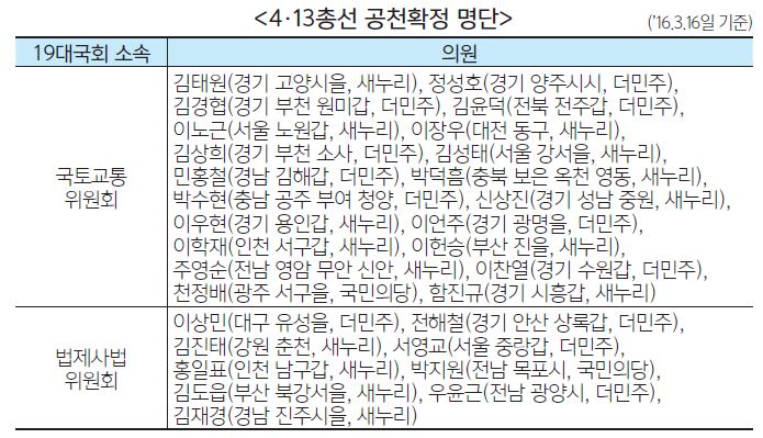16일 공천을 확정한 의원은 국토교통위원회의 김태원(경기 고양시을, 새누리), 정성호(경기 양주시시, 더민주), 김경협(경기 부천 원미갑, 더민주), 김윤덕(전북 전주갑, 더민주), 이노근(서울 노원갑, 새누리), 이장우(대전 동구, 새누리), 김상희(경기 부천 소사, 더민주), 김성태(서울 강서을, 새누리), 민홍철(경남 김해갑, 더민주), 박덕흠(충북 보은 옥천 영동, 새누리), 박수현(충남 공주 부여 청양, 더민주), 신상진(경기 성남 중원, 새누리), 이우현(경기 용인갑, 새누리), 이언주(경기 광명을, 더민주), 이학재(인천 서구갑, 새누리), 이헌승(부산 진을, 새누리), 주영순(전남 영암 무안 신안, 새누리), 이찬열(경기 수원갑, 더민주), 천정배(광주 서구을, 국민의당), 함진규(경기 시흥갑, 새누리) 의원 총 20명이다.