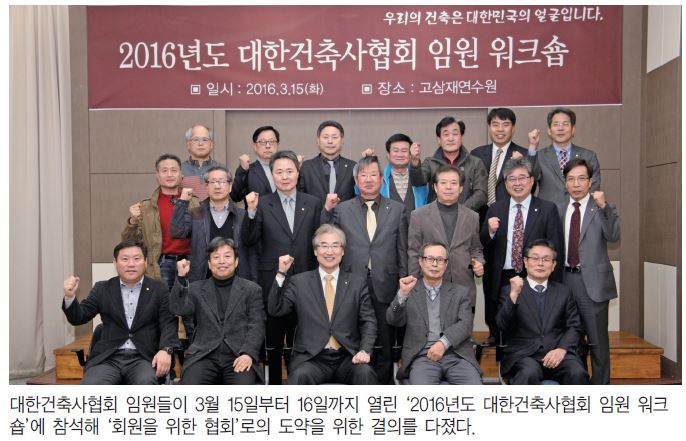 대한건축사협회는 3월 15일부터 16일까지 경기 안성시에 위치한 고삼재연수원에서 조충기 대한건축사협회 회장을 비롯한 전체 임원 22명이 참석한 가운데 ‘2016년 대한건축사협회 임원 워크숍’을 개최했다. 이날 워크숍에서는 ▶건축관계법령 및 제도개선 ▶연구용역(R&D) ▶교육사업 ▶국제교류활동 ▶건축문화행사 등의 협회 주요업무보고와 함께 협회발전 및 혁신을 위해 소통·단합해 건축계 환경변화에 능동적이며 선제적으로 대응하자고 뜻을 모았다.