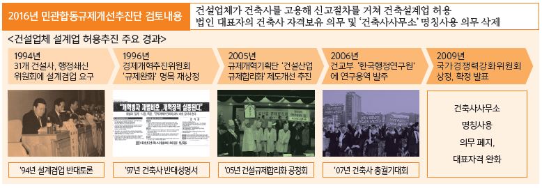 2009년에는 한국개발연구원에서 ‘전문자격사제도 개선방안 연구’을 발표하며, 건축사 진입규제 완화방안까지 구체적으로 제시한 바 있다.