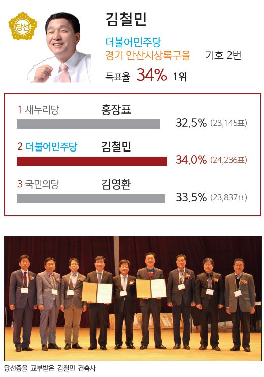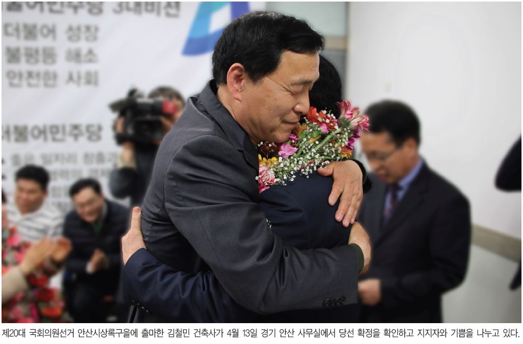 사상 최초 건축사 국회의원이 탄생했다. 안산시상록구을의 국회의원 후보로 나선 김철민 건축사가 20대 국회의원에 당선된 것. 안산시상록구을에서 총 24,236표를 얻어 20대 국회에 입성했다. 최종 개표결과, 김철민 건축사(더불어민주당) 24,236표, 홍장표(새누리당) 후보 23,145표, 김영환(국민의당) 후보 23,837표로 초접전이었다. 당초 야권분열로 고전이 예상됐지만, ‘약속을 지킨 사람’으로서 성공적인 안산시장 경험이 유권자들의 마음을 움직여 현역 건축사로는 사상 최초로 ‘건축사 국회의원 시대’를 열게 됐다. ‘건축사 국회의원’을 학수고대하던 건축사업계의 숙원이 마침내 풀렸다.