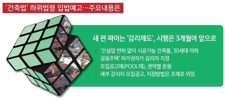 앞으로 허가권자가 공사감리자를 지정하는 건축물의 대상은 ‘건설산업기본법’ 제41조제1항 각호에 해당하지 아니하는 소규모건축물(단독주택 중 단독주택은 제외)과 건축법 제11조에 의한 건축허가대상 건축물로서 분양을 목적으로 하는 아파트·연립주택·다세대주택(30세대 이하)이다.
